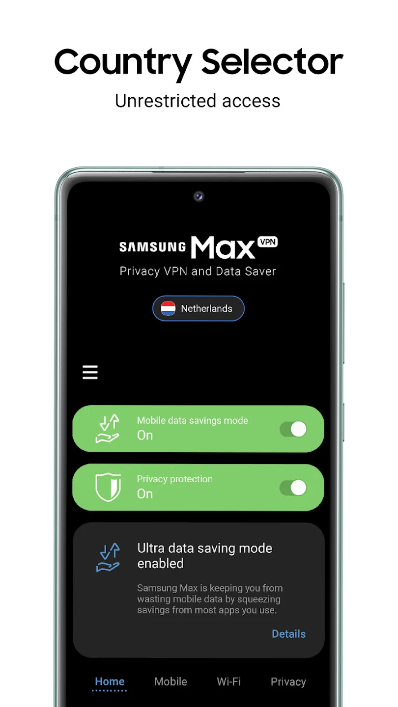 Samsung Max VPN, yalnızca güvenliğinizi sağlamakla kalmaz; aynı zamanda YouTube, Netflix, Instagram gibi yüksek veri kullanan uygulamalarda önemli oranda mobil veri tasarrufu sağlar.