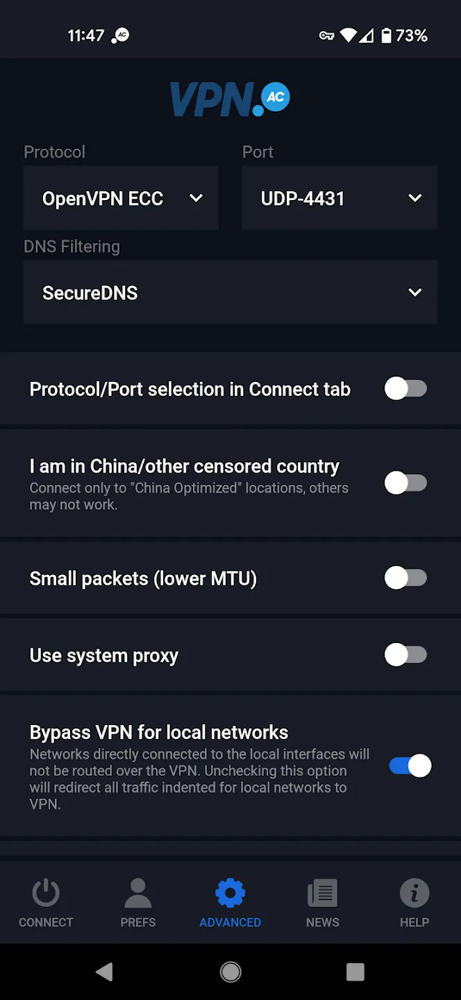 VPN.AC, 256-bit şifreleme desteği, DNS sızıntı koruması ve ileri düzey sunucu seçenekleriyle profesyonel VPN altyapısını mobil cihazlara taşır. Uygulama, veri gizliliğini en üst seviyede tutmak isteyen kullanıcılar için özel olarak geliştirilmiştir.